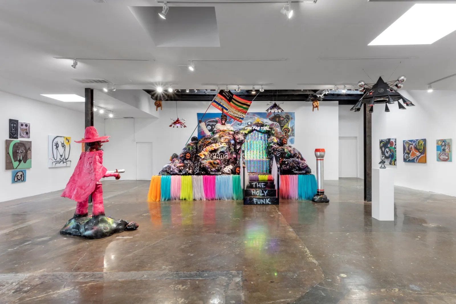 The centerpiece of the exhibition will be Moia Dat (2022), a monumental painting featuring an image of Clinton’s Mothership, the fantasy space vehicle that would descend onto the stage during Parliament / Funkadelic performances from which Clinton’s alto ego, Dr. Funkenstein would emerge.