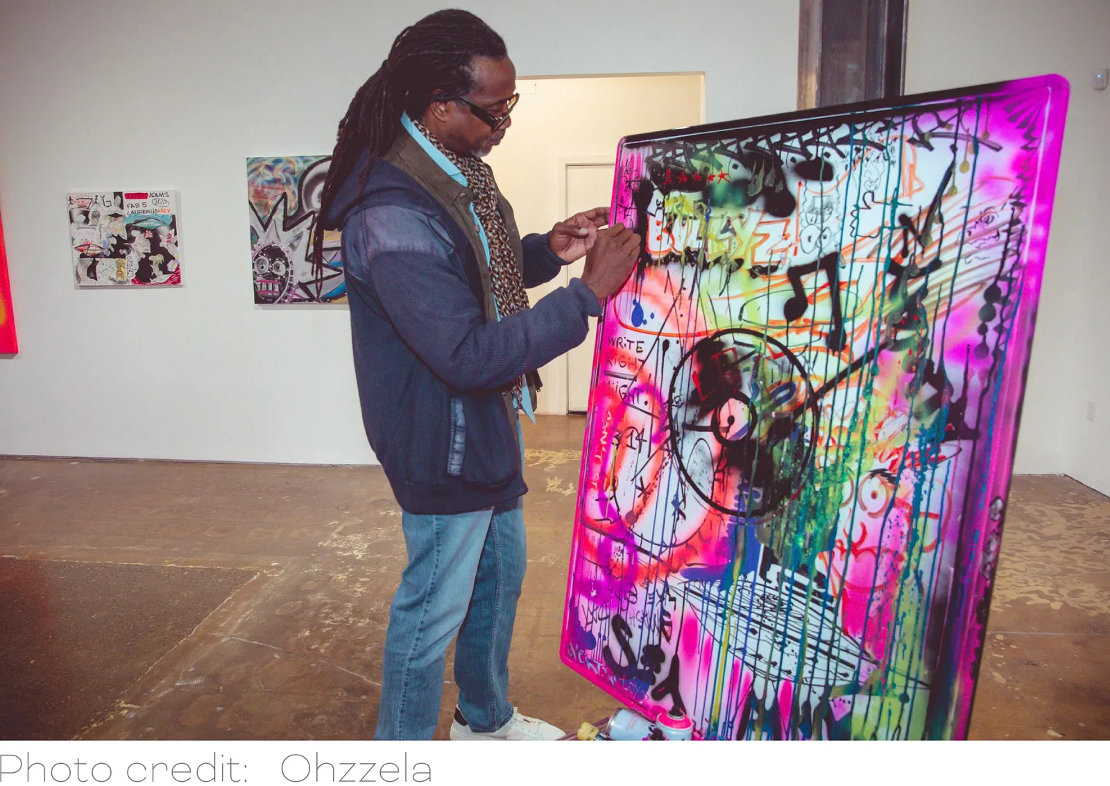 acrylic, spray paint, vine charcoal, charcoal, oil pastel and chalk on canvas